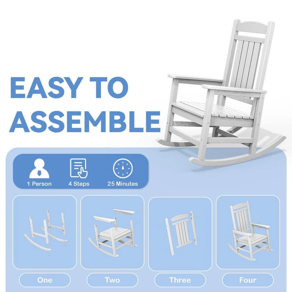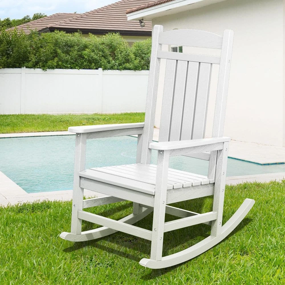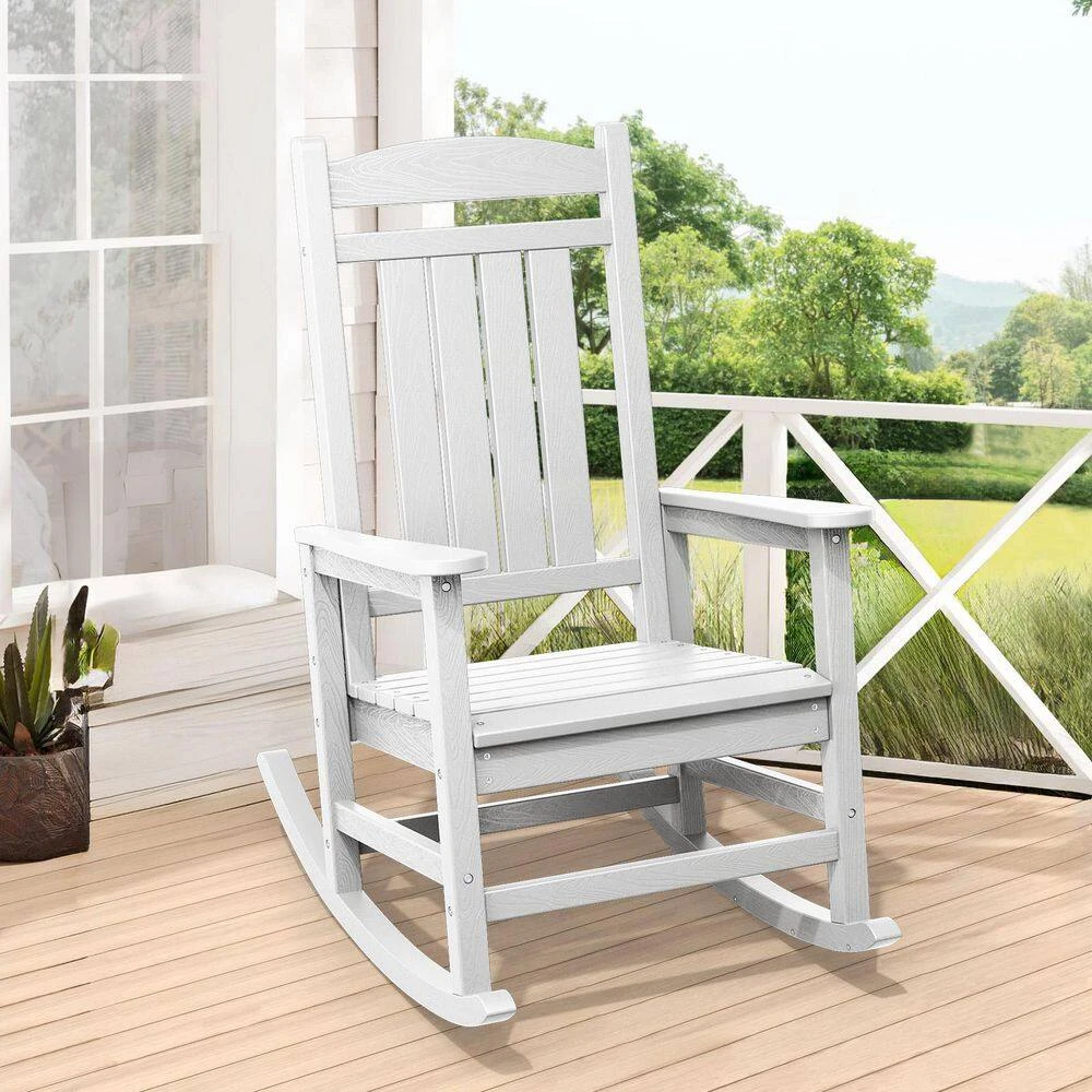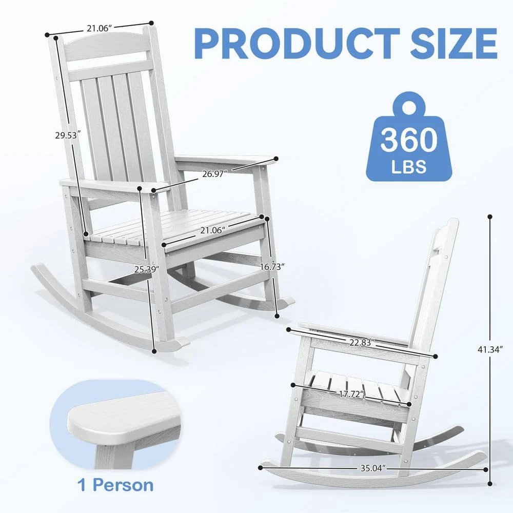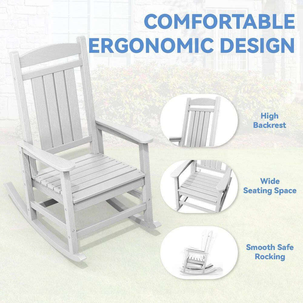 The Outdoor Slat Rocking Chair is made of durable HDPE material , ensuring it’s all-weather resistant, fade-proof, and waterproof. It features a contoured seat, widened armrests, and a slatted backrest for ultimate relaxation. With a 360lbs weight capacity , it’s suitable for most adults. The chair has a streamlined slat-structure design, ergonomic curved structure, and attached stainless steel screws for added durability. It’s easy to maintain, requiring only water and soap . The chair comes with all necessary hardware and can be assembled in 30 minutes . It’s available in multiple colors , including navy blue, gray, brown, black, and white, and its classic style blends perfectly into any decor.