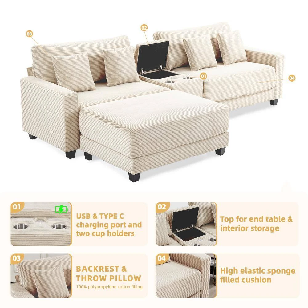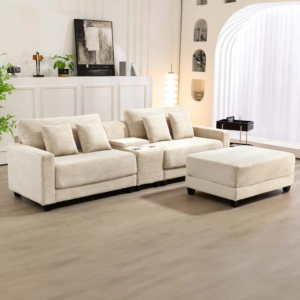 Laibai 111.81 In. Square Arm Velvet Modular 3-Piece Modern Sofa With Cup Holder And Ottoman In Beige