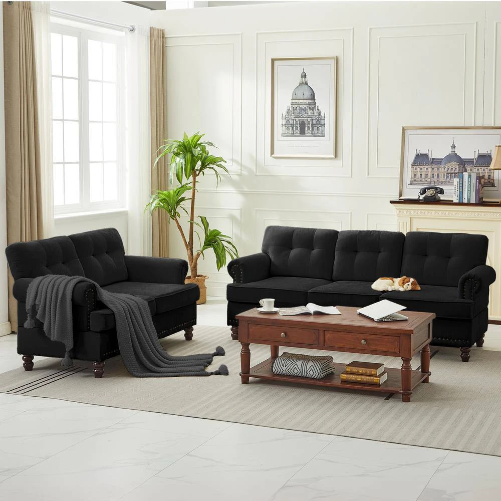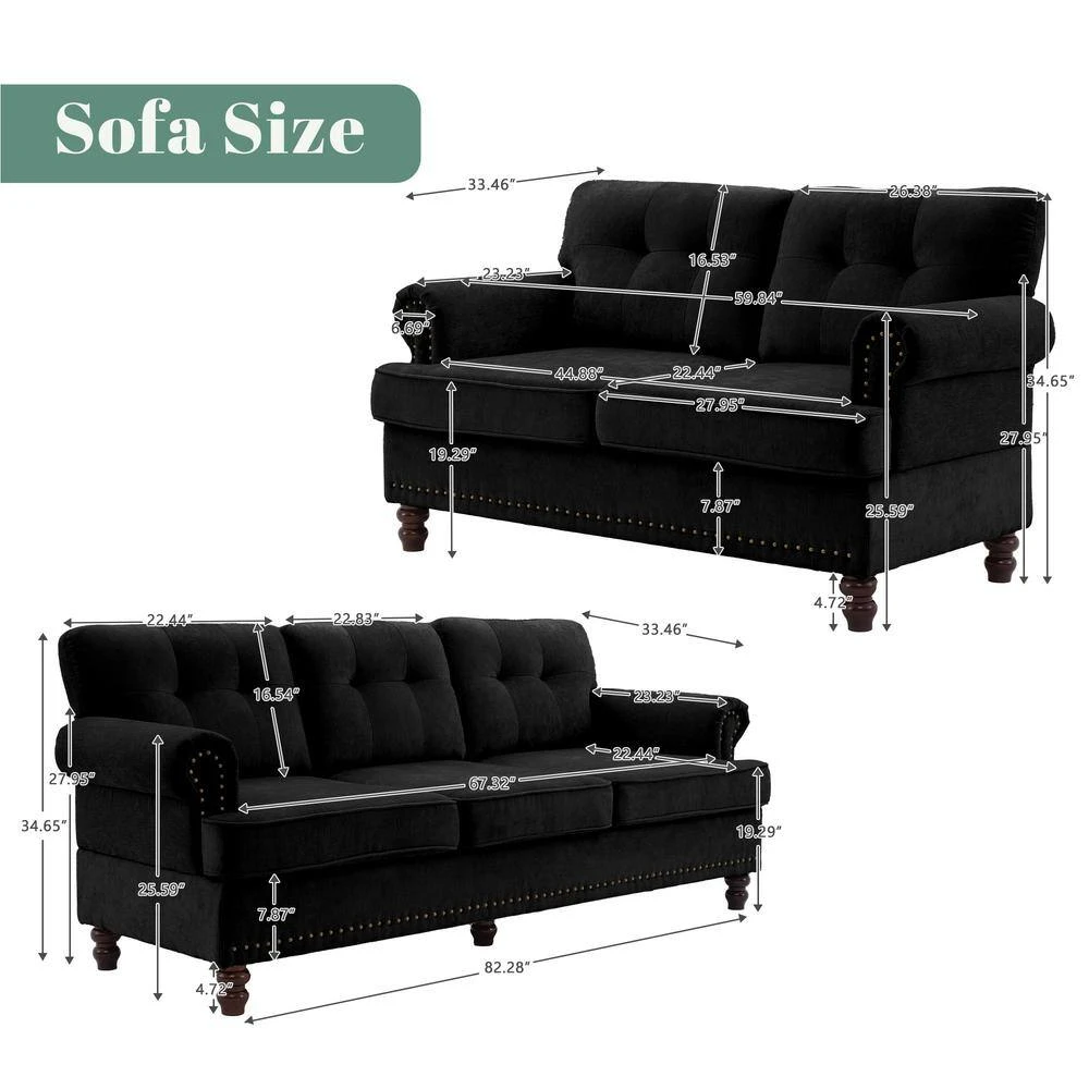Modern 2-Piece Black Chenille Loveseat And Sofa Living Room Set With Nailhead Trim And Rubberwood Legs