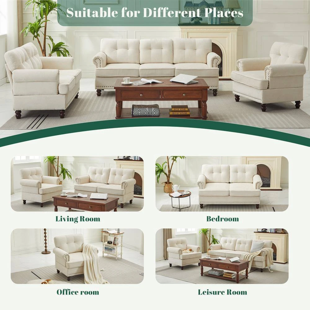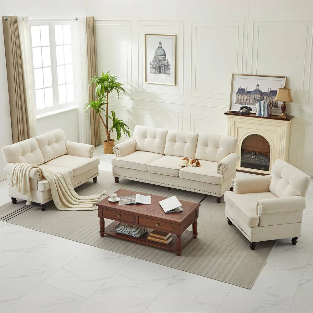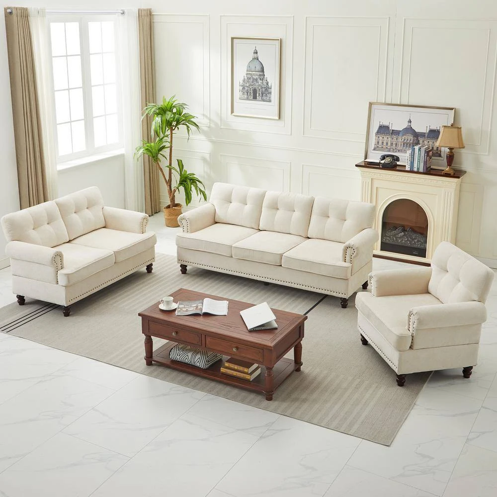 This living room set furniture trio is stylish and cozy. This living room sofa set includes a loveseat, an accent chair, and a sectional for your entire family to snuggle up in comfort. The living room sofa backrests feature summary tufting and an additional studded design. The legs are made of rubberwood. This design fits any home decor.