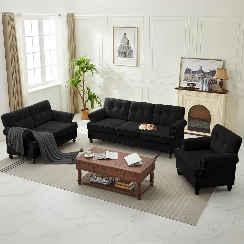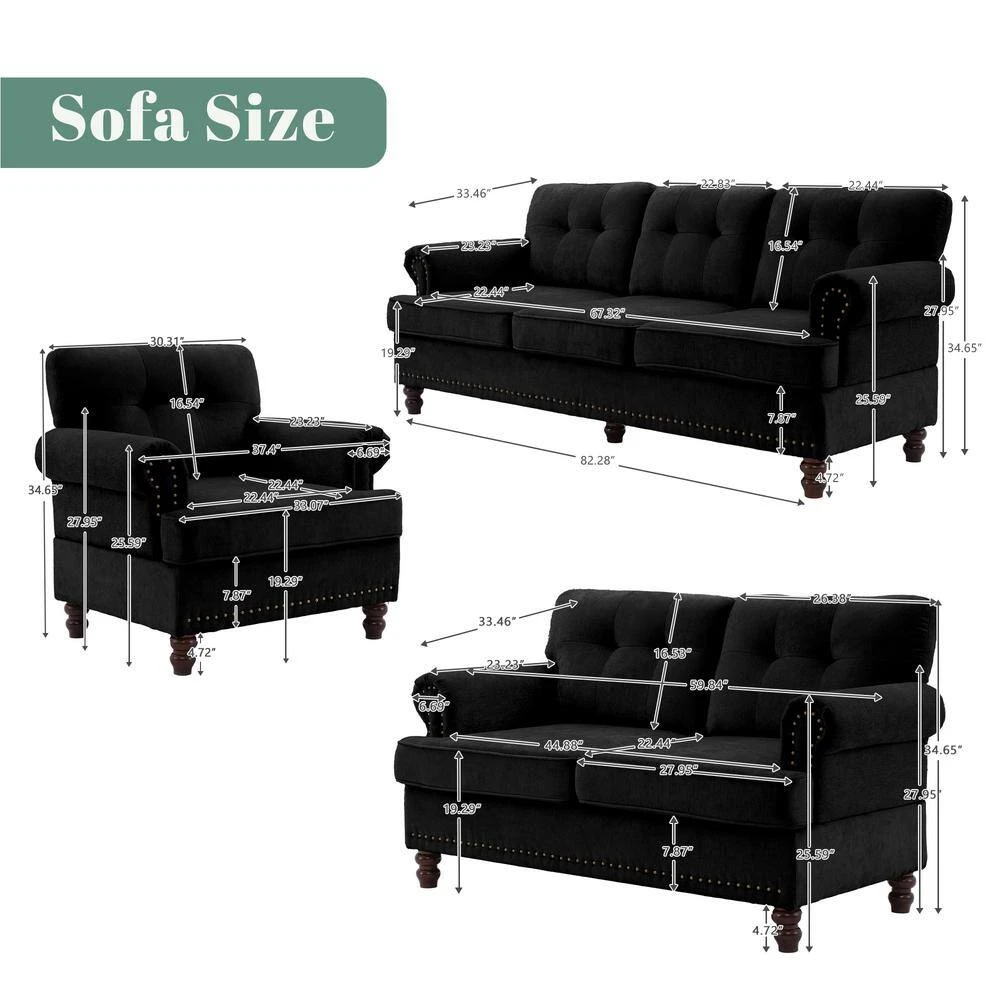 This living room set furniture trio is stylish and cozy. This living room sofa set includes a loveseat, an accent chair, and a sectional for your entire family to snuggle up in comfort. The living room sofa backrests feature summary tufting and an additional studded design. The legs are made of rubberwood. This design fits any home decor.