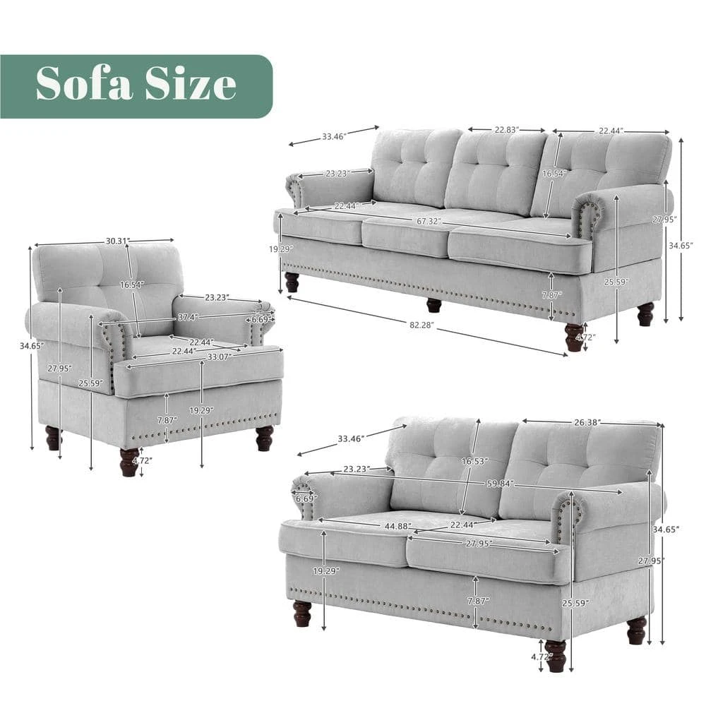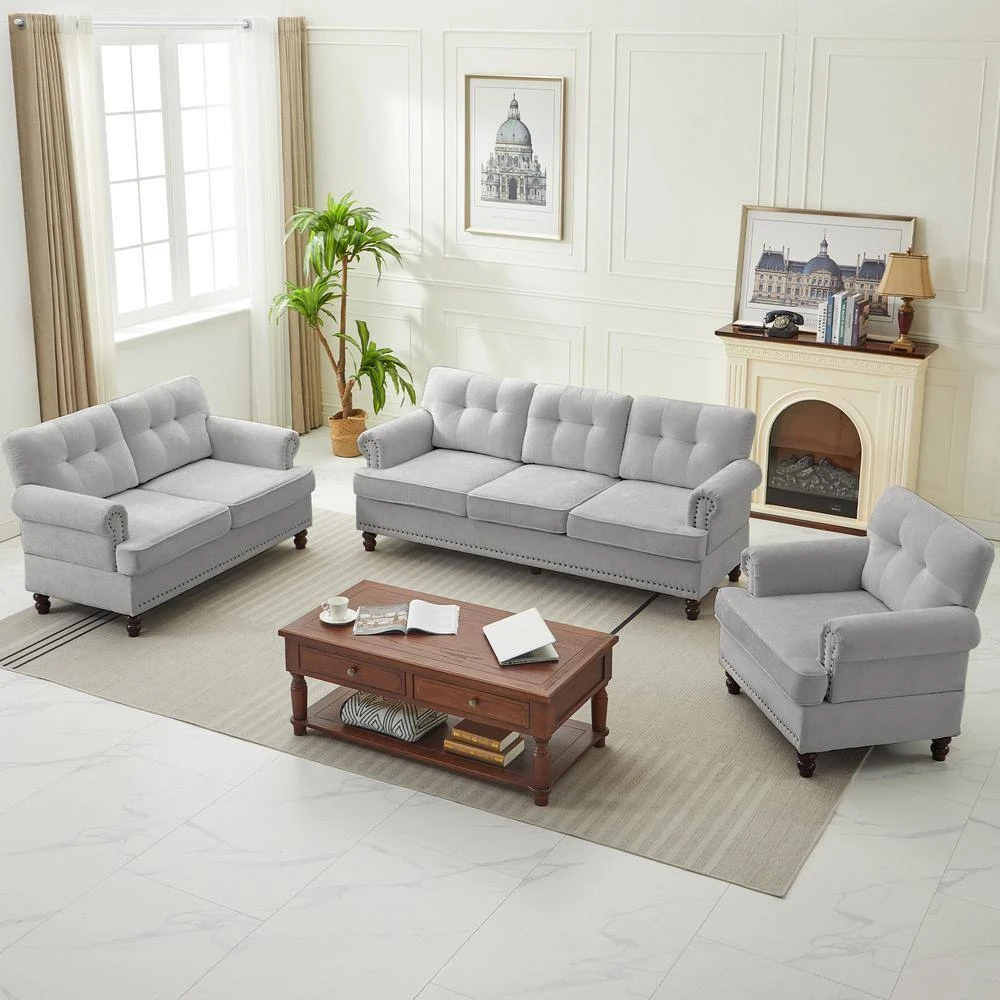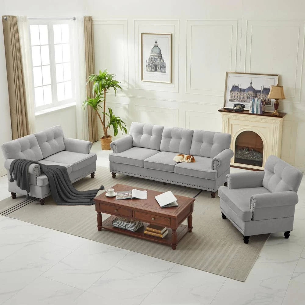 This living room set furniture trio is stylish and cozy. This living room sofa set includes a loveseat, an accent chair, and a sectional for your entire family to snuggle up in comfort. The living room sofa backrests feature summary tufting and an additional studded design. The legs are made of rubberwood. This design fits any home decor.