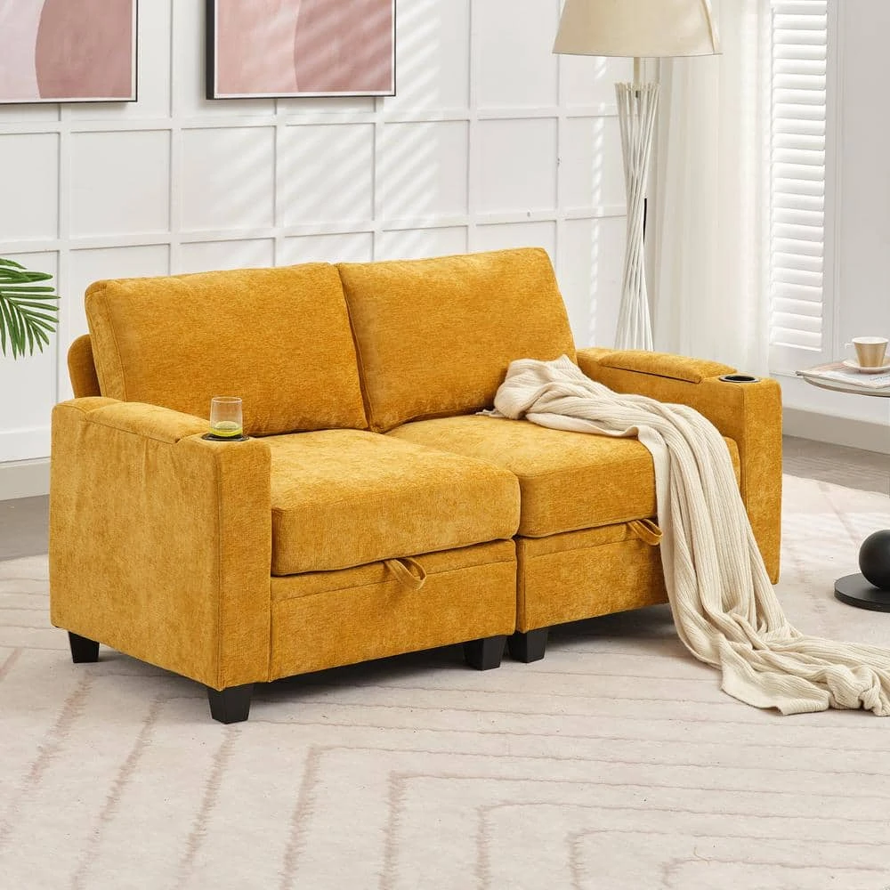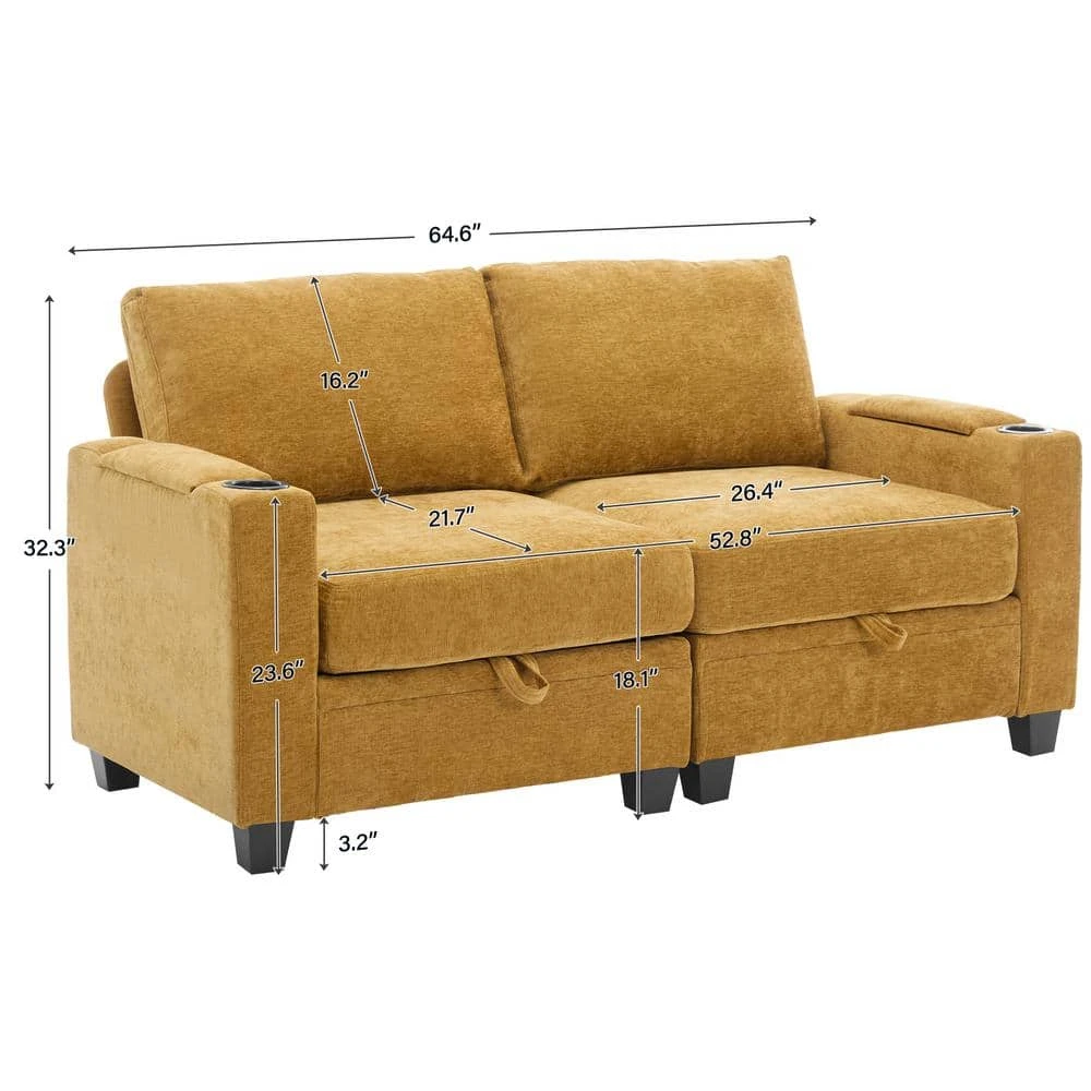 Modern 64.6 In Yellow Chenille Storage Loveseat With Cup Holder And Ottoman For Living
