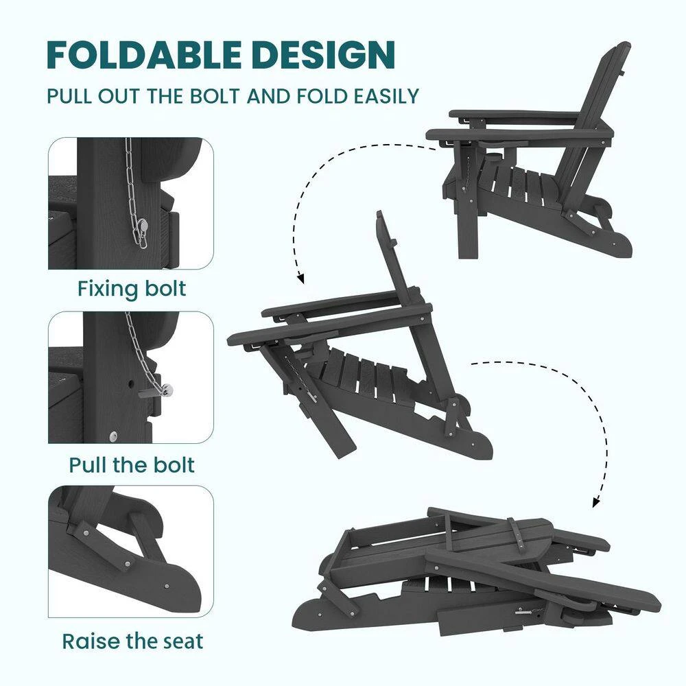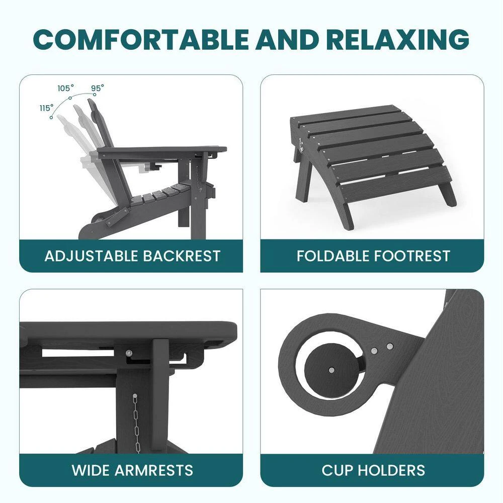 Our HIPS Folding Reclining Plastic Adirondack Chair Set with Ottoman and Table will create a cozy getaway right outside your home. Made with a weather-resistant composite, this Patio Chat Set brings a beautiful rustic influence to your backyard or patio and tops it off with a sleek modern finish, it matches perfectly for any deck, patio, or poolside relaxation to create a charming space for all to enjoy. Different with HDPE material, our HIPS chair set has the traditional deluxe texture of solid wood, but perfectly improves the shortcomings of solid wood, which is easy to decay, crack and mold, especially in rainy days. We choose this material to make sure that you can use it longer and more worry-free. Designed with 3 adjusted position to meet different comfortable needs, and with foldable Ottoman, when you don’t want to use ottoman, it can be folded and hided under the chair for storage. The side table has a slat-top surface. All contents are packed in 1 box. Light assembly required.