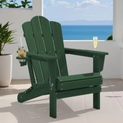 Classic Outdoor HDPE Folding Plastic Adirondack Chair With 2 Cup Holders In Green (Set Of 1)