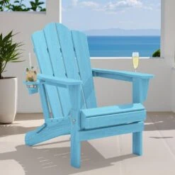 Classic Outdoor HDPE Folding Plastic Adirondack Chair With 2 Cup Holders In Light Blue (Set Of 1)