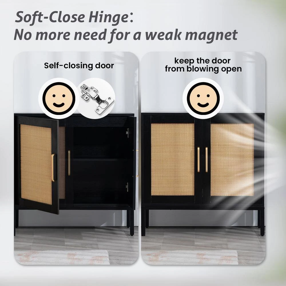 - Soft-close hinges: the buffet sideboard cabinet doors are secured with soft close cabinet hinges these hinges ensure that the cabinet doors close tightly and stay firmly closed this design ensures that the cabinet stays sealed and won’t open unexpectedly when you’re not aware of it, in addition, the metal hinges allow buyers to freely adjust the cabinet doors both vertically and horizontally, eliminating the problem of uneven use caused by aging magnetic cabinet doors
