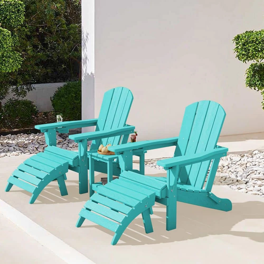 Tiffany Blue Outdoor 5-Piece HDPE Plastic Patio Chat Set, 2-Adirondack Chairs With Side Table And 2-Folding Ottomans