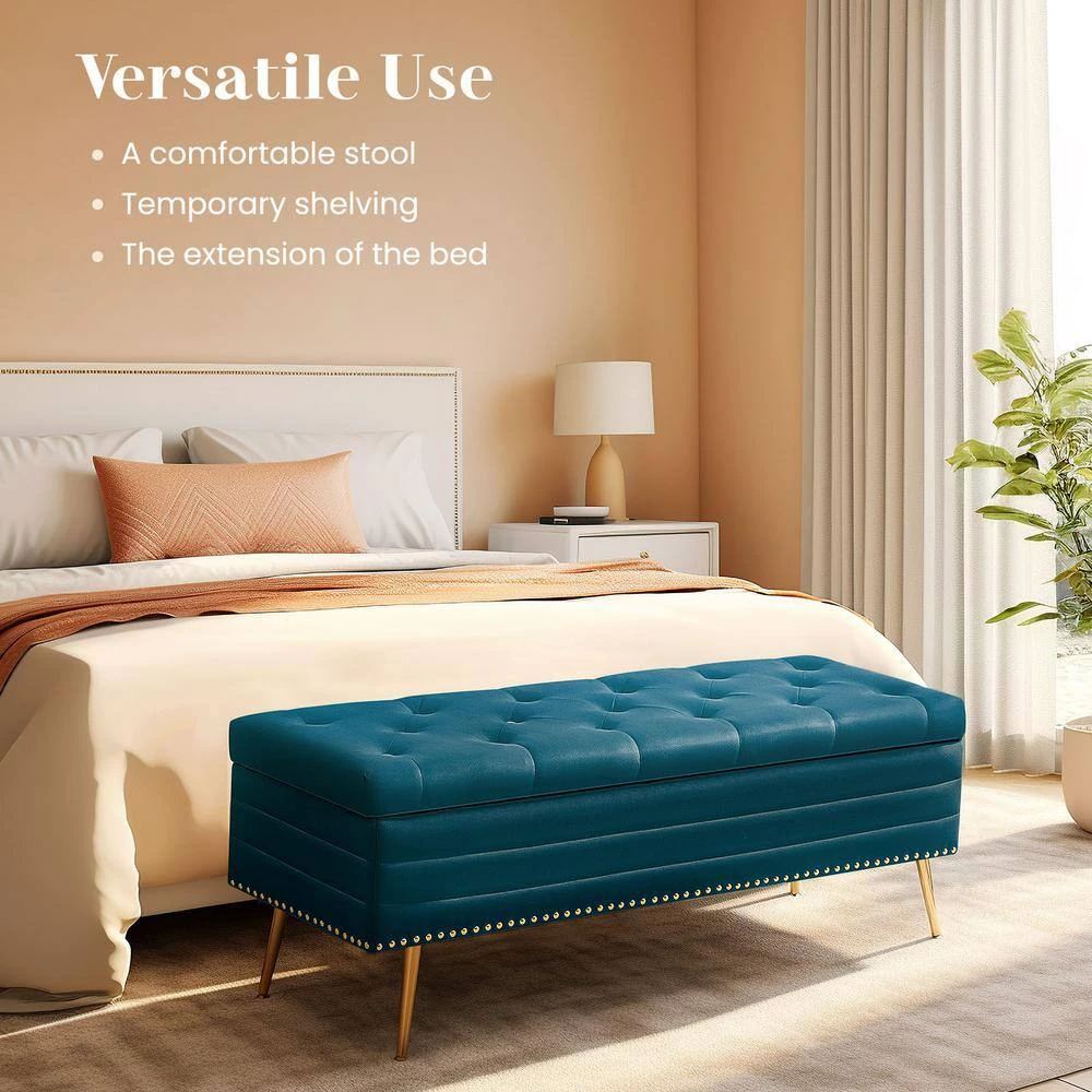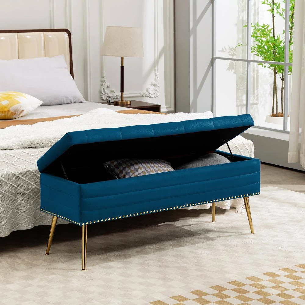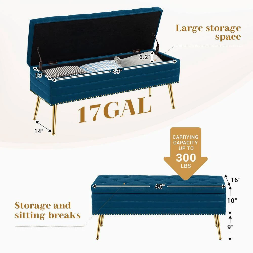Velvet Navy Storage Ottoman Entryway Bench With Gold Base And Diamond Tufted Design For Living Room