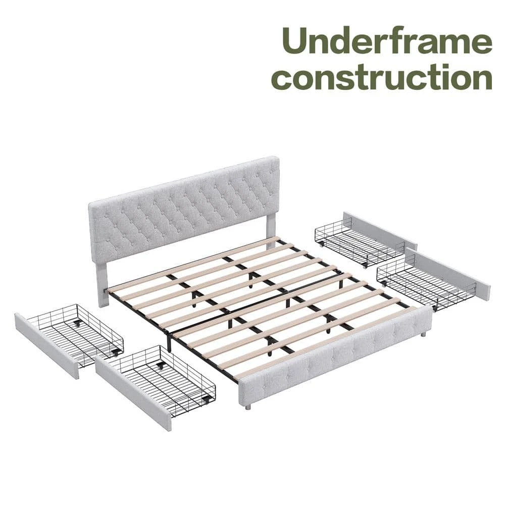 - Convenient storage solution: Say goodbye to clutter and hello to a tidy bedroom. Our queen storage bed frame comes with four spacious under-bed storage drawers on wheels. Ideal for organising out-of-season clothes, quilts and smaller items, these drawers ensure your belongings are neatly stored away. We also supply 4 matching drawer liners to prevent tipping and keep everything in place to protect your belongings.